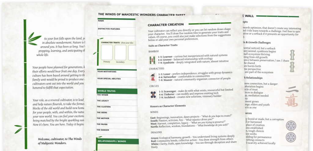 The Winds of Mahjestic Wonders is a solo roleplaying / journaling game based on mahjong tiles with solarpunk themes of community, sustainability, innovation, and hope.