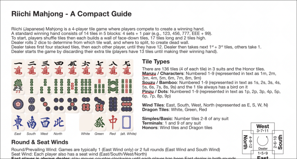 After going through the learning process of riichi mahjong I thought it would be nice to have a compact, low-ink, single-page FAQ and Guide that curious players could print out for their reference. Perhaps it is trying to do too much for a single page, but I figured I’d put it out to the world.